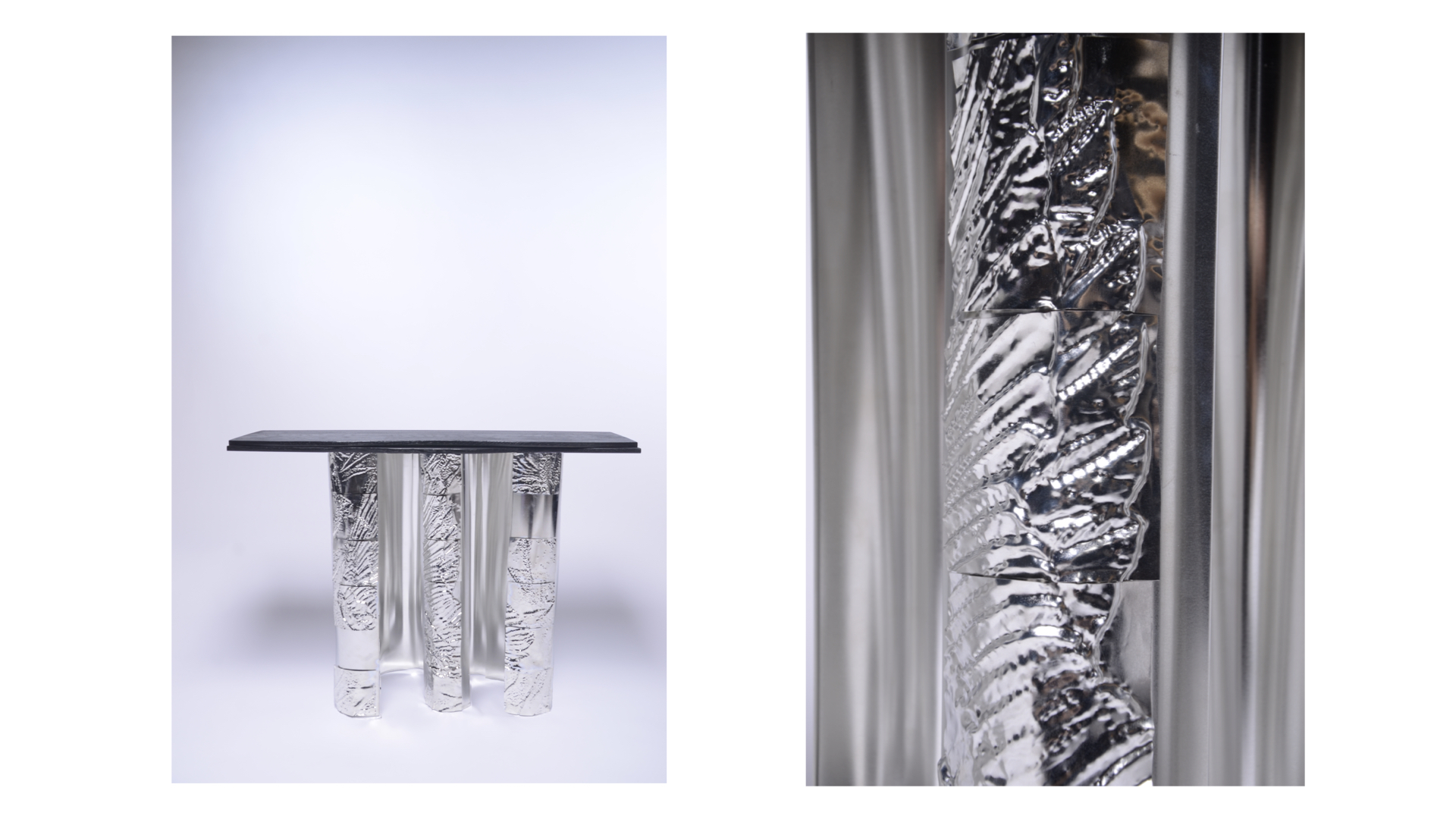 The console's tabletop, in a sleek and commanding black finish, provides a contrast to the metallic legs and adds a touch of opulence. Each leg, crafted with metal, is meticulously pressed with 3D modeled and prints of a drawing that pays homage to the myth of Icarus. Parts of the legs manifests an error and reveals the original structure of the leg, reflecting the rise and fall with with the intrinsic horizontal beams of metal.
